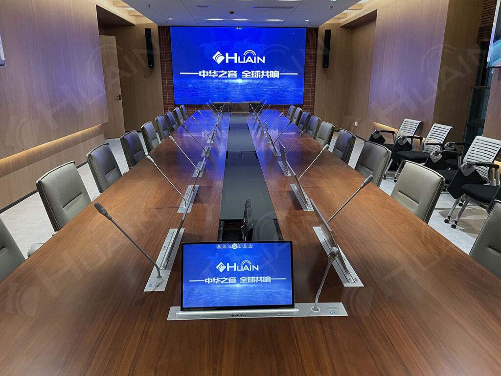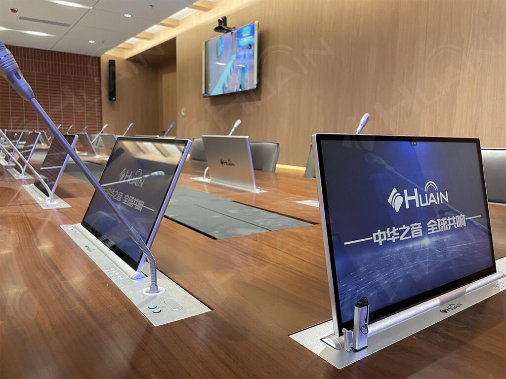 Màn hình và micro nâng hạ đồng bộ: Tốc độ nâng hạ mượt mà, không lo vấn đề dây cáp, phòng họp gọn gàng và thẩm mỹ hơn.